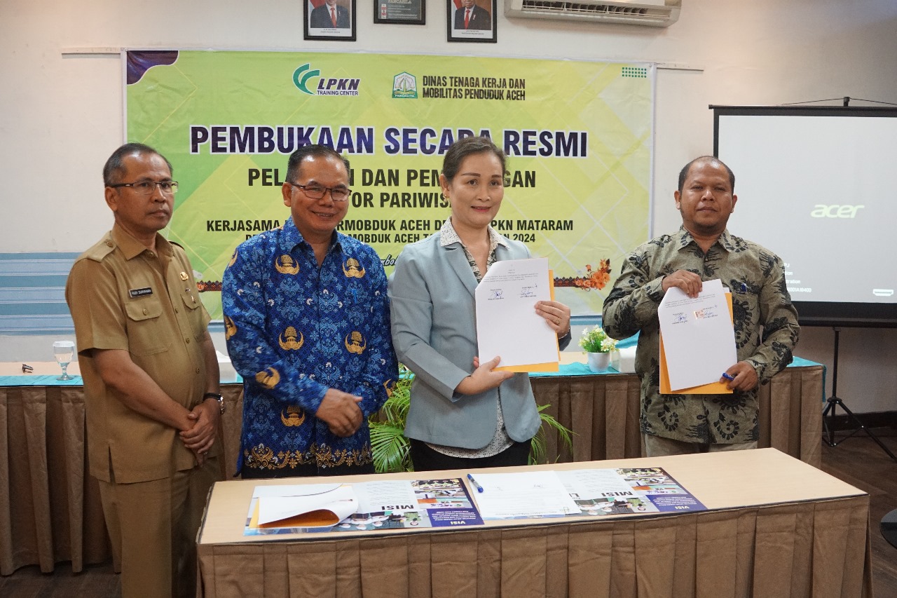 Kegiatan pembukaan ini dihadiri oleh Kadisnakertrans Kota Mataram, Lalu H. Rudi Suryawan, Kepala Seksi Penyelenggaraan Pelatihan dan Kelembagaan Disnakermobduk Aceh, Taswir, ST., M.Si., dan Kepala Seksi Pemagangan dan Peningkatan Produktivitas Disnakermobduk Aceh, Veraningsih, S.Tp.
